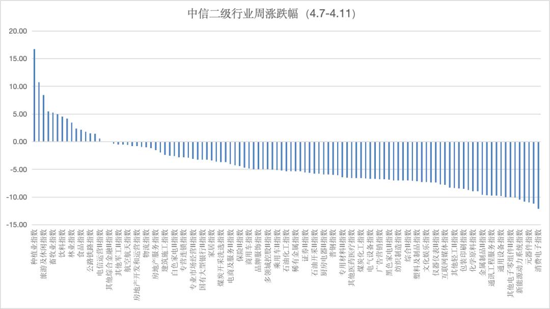 根据中信二级行业分类,本周涨幅靠前的板块是种植业、零售、旅游休闲、农产品加工及贵金属板块,上涨幅度分别为16.76%、10.76%、8.45%、5.45%及5.00%;本周跌幅靠前的板块是消费电子、元器件、通信设备、新能源动力系统及汽车零部件板块,下跌幅度分别为-12.11%、-10.98%、-10.82%、-10.45%及-10.12%。