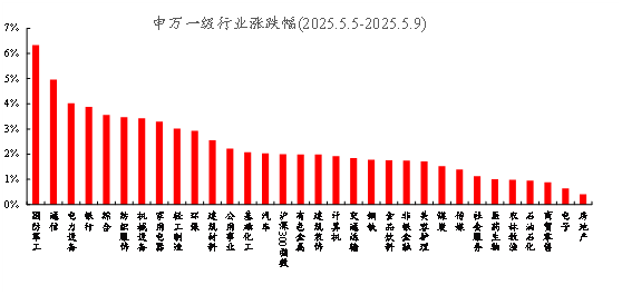 行业方面,根据申万一级行业分类,本周涨幅靠前的行业有国防军工、通信、电力设备、银行、综合,分别上涨6.33%、4.96%、4.02%、3.88%、3.55%;本周涨幅靠后的行业有房地产、电子、商贸零售、石油石化、农林牧渔,分别上涨0.41%、0.64%、0.88%、0.95%、0.99%。