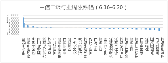 根据中信二级行业分类,涨幅靠前的行业有新兴金融服务Ⅱ、兵器兵装Ⅱ、元器件、油服工程、通信设备,分别上涨16.39%、7.06%、6.02%、4.57%、3.40%;跌幅靠前的行业有专营连锁、文娱轻工Ⅱ、摩托车及其他Ⅱ、化学制药、生物医药Ⅱ,分别下跌6.48%、5.94%、5.14%、5.1%、4.72%。