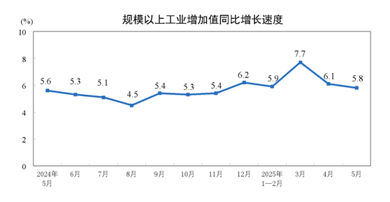 5月份,规模以上工业增加值同比实际增长5.8%(增加值增速均为扣除价格因素的实际增长率)。从环比看,5月份,规模以上工业增加值比上月增长0.61%。1—5月份,规模以上工业增加值同比增长6.3%。