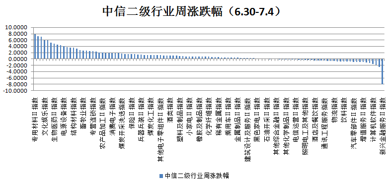 本周上证指数涨1.40%,创业板指数涨1.50%,沪深300指数涨1.54%,中证500指数涨0.81%。根据中信二级行业分类,本周涨幅靠前的行业是专业材料、普钢、摩托车、文化娱乐及元器件,上涨幅度分别为7.73%、7.14%、7.03%、5.99%、5.90%;本周跌幅靠前的行业是新兴金融、多领域控股、航空机场、计算机软件及云服务,下跌幅度分别为7.97%、2.48%、1.90%、1.50%、1.21%。